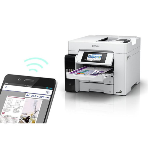 Tiskárna je vybavena velkým 10,9cm barevným dotykovým displejem, který usnadňuje ovládání. Podporuje USB, Ethernet, Wi-Fi, Wi-Fi Direct i NFC. S aplikacemi Epson Smart Panel, iPrint nebo Apple AirPrint můžete snadno tisknout přímo z mobilních zařízení. Samozřejmostí je i podpora PCL a PostScript pro firemní prostředí.