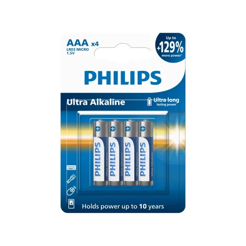 Philips alkalická baterie AAA, 4-pack, Ultra Alkaline, (LR03E4B/10) Právě prohlíží 2 zákazníci 0x Philips alkalická baterie AAA, 4-pack, Ultra Alkaline, (LR03E4B/10) Přidat do mých “Oblíbených produktů” 41 Kč 34 Kč bez DPH Balení 4-pack Záruka 2 roky Skladem > 9 ks , 18.12.2025 u vás Kdy a jak zboží dostanu? Nákupem získáte 1 zlaťák. K čemu jsou zlaťáky? − Množství + Přidat do košíku